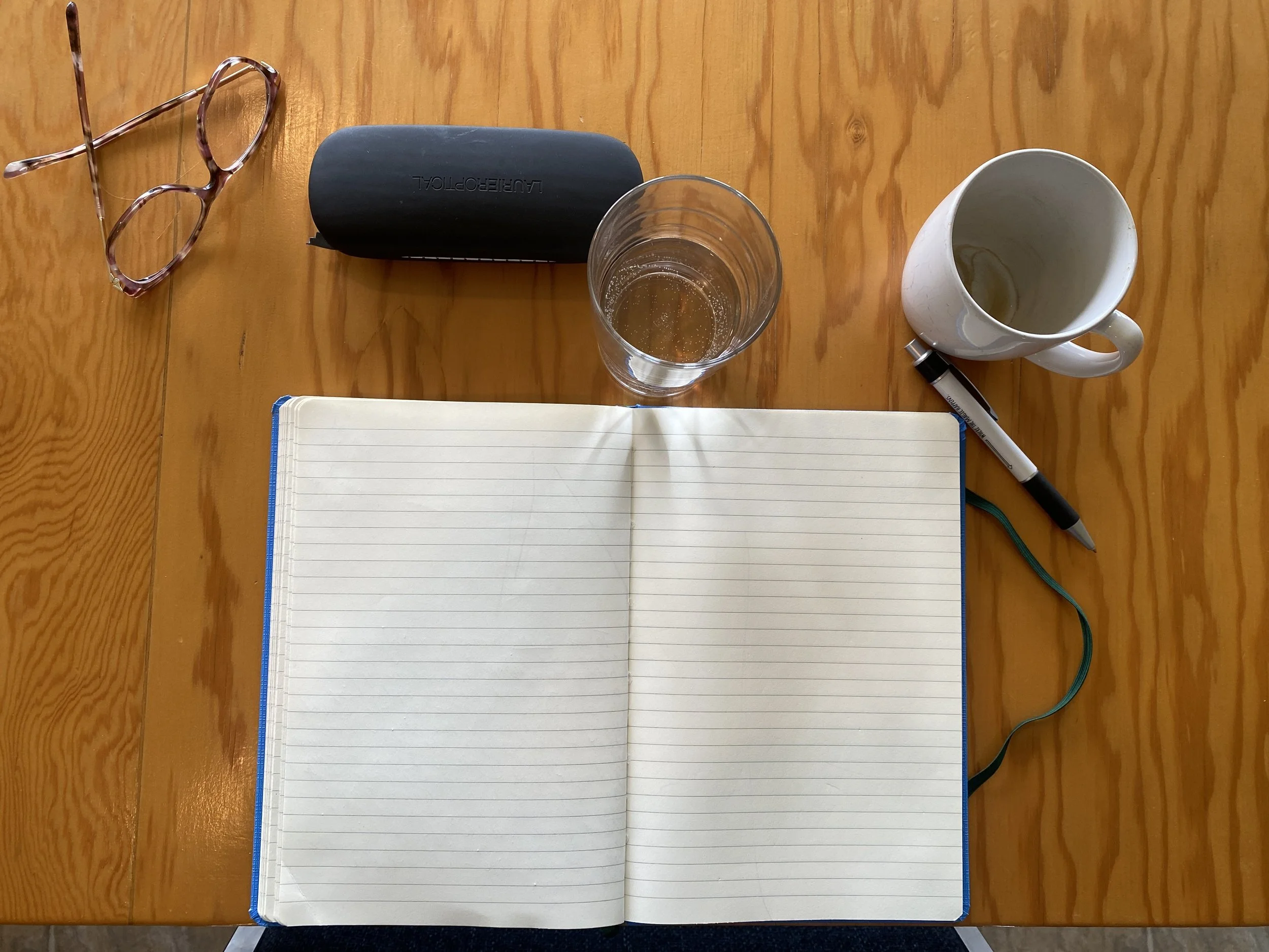 A top-down view of an open notebook, glasses and case, a glass of water, a mug, and a pen — all on a wood desk.